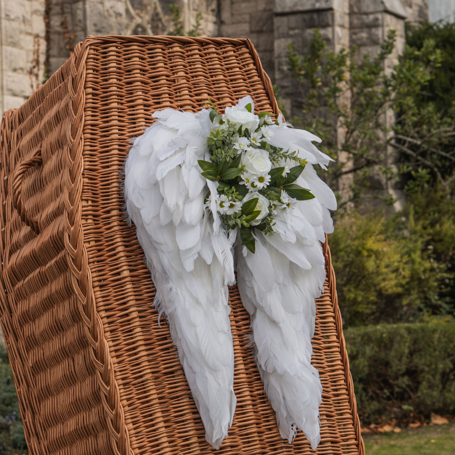 This graceful angel wings arrangement, delicately crafted with soft white feathers and elegant floral embellishments. Symbolising peace, purity, and protection, this design reflects the idea of a loved one being carried gently to rest. A beautiful and uplifting tribute, it offers comfort and expresses everlasting love and remembrance.